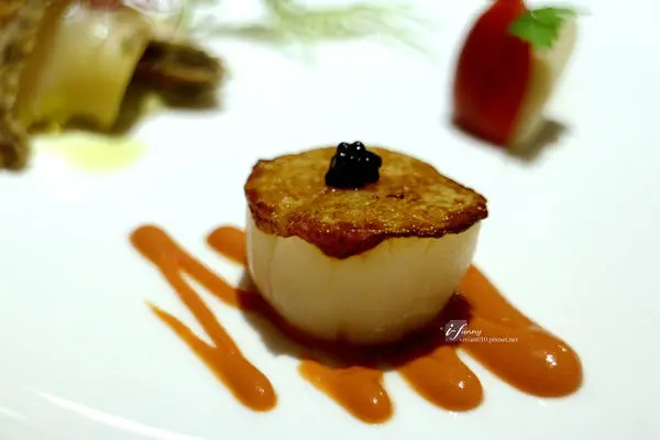 採生食等級的干貝兩面微微炙燒,上方佐以魚子醬做裝飾。