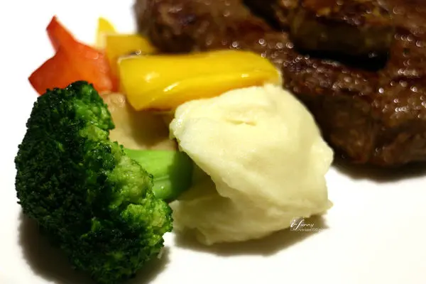 一旁附了時蔬及馬鈴薯泥,綿密鬆軟的馬鈴薯泥入口即化,好吃得緊啊!