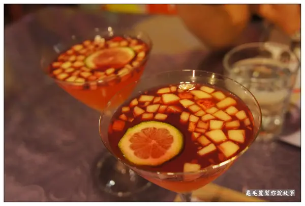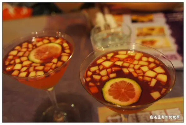 裡面以紅酒當基底,加上蘋果丁和一點鳳梨丁。充滿果香,超好喝!聽說酒精濃度很低,但酒量極差的我,居然會臉紅發熱…微醺的感覺很舒服。