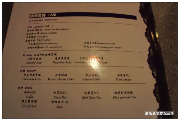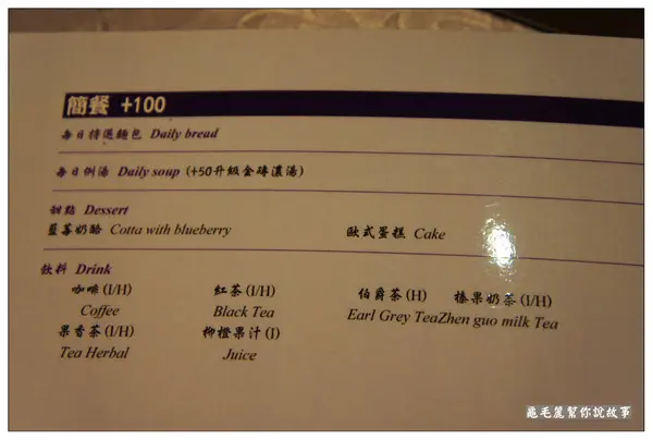 簡餐+100元,有附麵包、前菜、每日例湯(+50元可升級金磚濃湯)、飲料(六選一)、蛋糕(二選一),