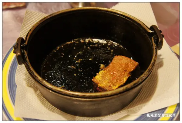 「佛羅倫絲黑炫鍋」是店裡吃雞排飯或是牛排飯用的,燒熱的鐵鍋上桌,香氣十足。在食物吃進肚裡前,耳朵先聽到聲音,鼻子聞到香氣,眼睛看到熱氣…奶油、蒜頭、青蔥那香氣真是驚人!放入牛排再度加熱,等於一塊牛排兩種吃法。