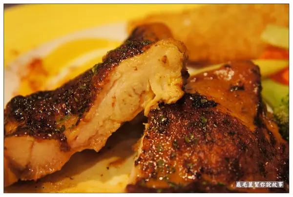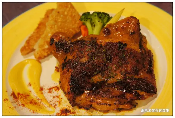 一整隻的去骨雞腿排,一旁搭配的是炸魚排,加上黃芥末。 雞腿非常鮮嫩多汁,邊邊的皮烤得有點焦,但油脂都被烤掉了,所以吃起來不會有任何油膩感。