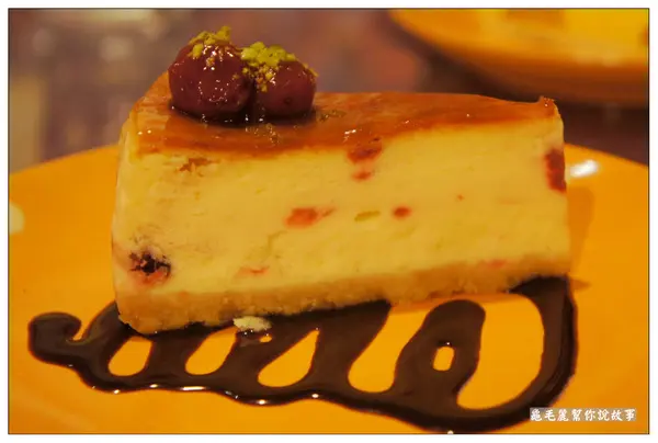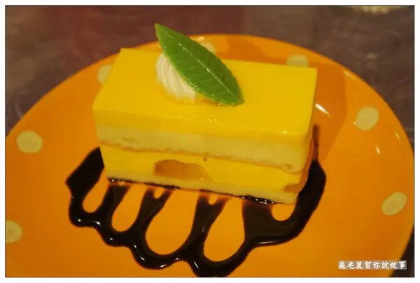 上面的芒果醬好香,綠色葉子帶點香甜,感覺像是糖果,慕斯感覺很柔順,加上蛋糕夾層,口感很細緻,搭配得宜,一整個就是好好吃! 尤其中間有一點果粒和椰果,口感更豐富。 起司蛋糕