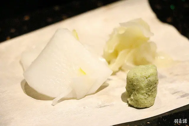 上餐前主廚會先準備嫩薑 芥末 醃蘿蔔在一旁