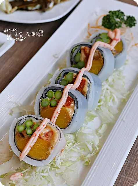 清爽的招牌菜還包括這道,只用了河粉皮和海苔,裡面包入了水蜜桃、蘆筍再擠上了明太子沙拉醬