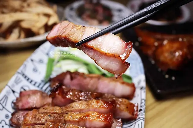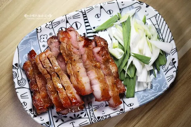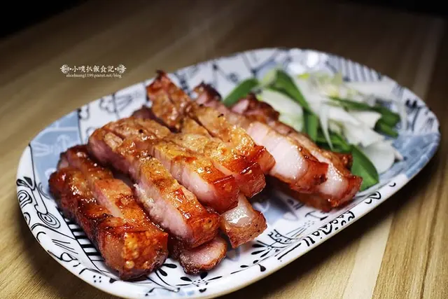 鹹豬肉外層烤製焦香皮脆,QQ的豬皮,加上內層的醇香瘦肉及飄香的肥肉,整體相當鹹香美味,搭配一些蒜苗,更添滋味