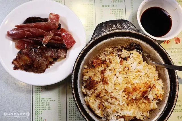 首先將臘味煲仔飯上桌,服務員會將店家自製的醬汁先澆淋在煲仔飯上,之後將臘味夾起至盤中,再加入醬汁,翻動鍋內米飯,趁著熱氣,將醬汁均勻的分佈到每一粒米飯中
