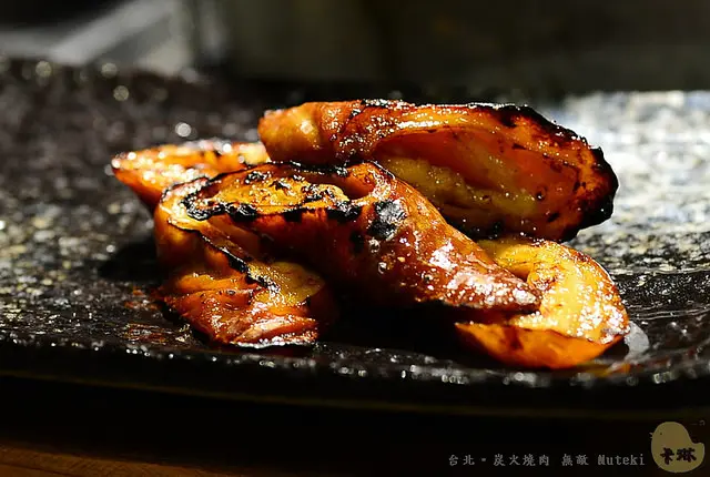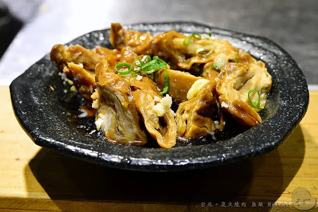 無敵肥腸烤的外層略酥內層則嫩,烤後的油脂使之更加順口,香氣重且不會太膩。