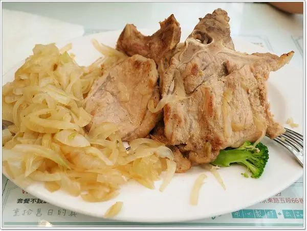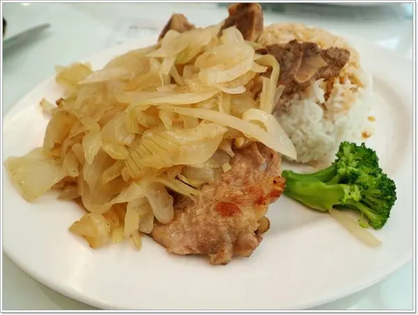 兩大塊的豬扒,以刀叉進食,很有吃西餐的FU~米飯吃起來似乎是泰國米,淋上的醬汁甜甜的,很下飯。