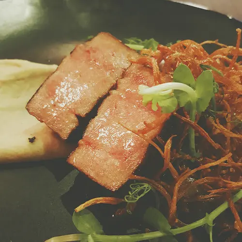 不同於常見的羊小排,這邊採用的是羔羊肩排,口感上更加細緻軟嫩,形狀上很有趣,長得像是夜市攤販賣的雞腿捲;搭配的醬汁也極富有巧思,醬汁是苦巧克力,裝飾提味的則是三種類的辣椒,值得一提的則是翡翠椒,辣度較高,雖然店家有先提醒,但還是因為翠綠的外觀而小覷,果不其然一入口隨即被嗆得滿臉通紅。