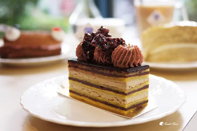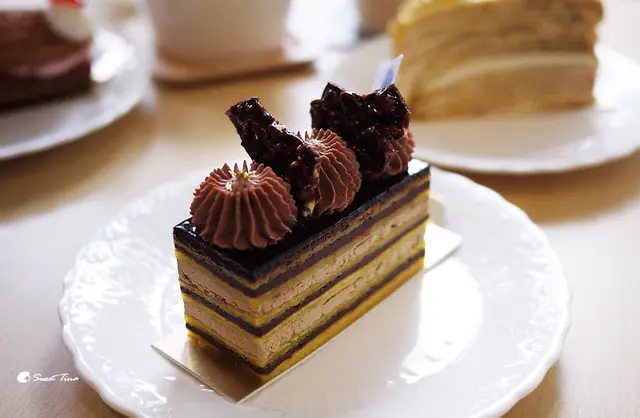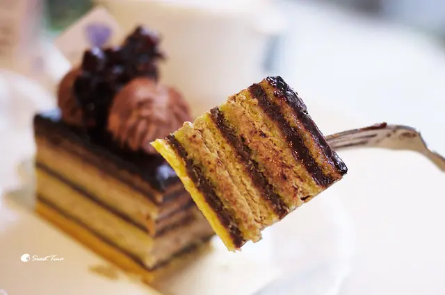 經典歐貝拉 - 杏仁蛋糕、咖啡蛋奶醬、法國巧克力甘納許,這款是屬於微大人的美味口感,有點苦有點甜還透出淡淡的咖啡香氣,Tina覺得這口感挺有層次且有深度呢~