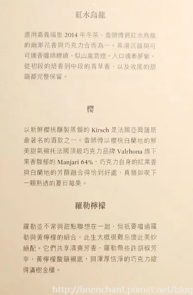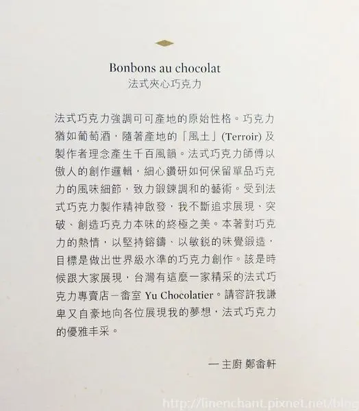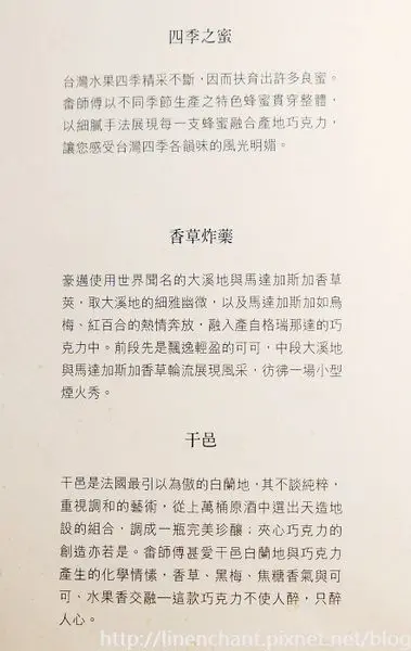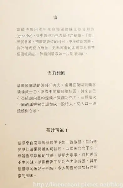 我其實不是個太偏愛巧克力的人,因為大多時候吃到的巧克力總會覺得甜膩~但這裡的巧克力是有深度、厚實,很成熟的味道...