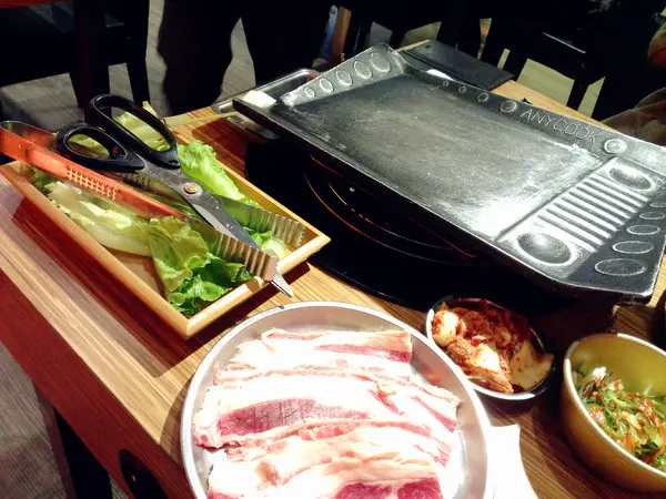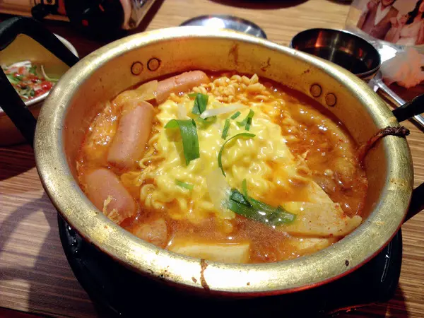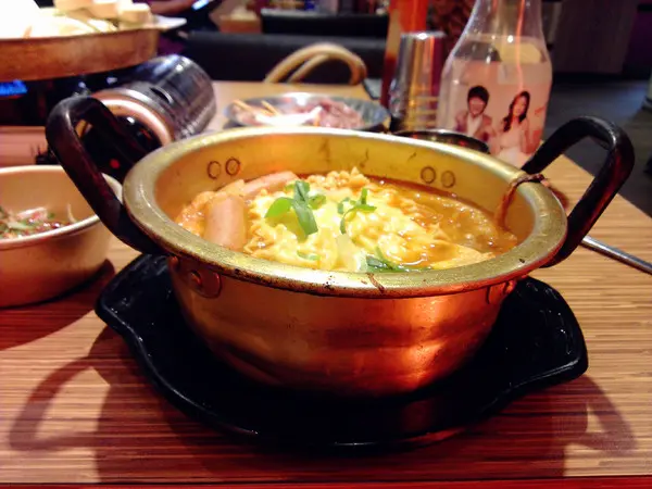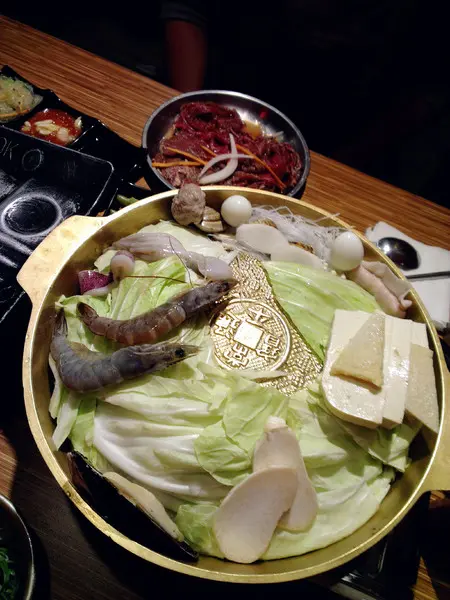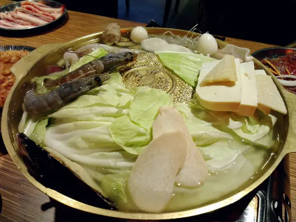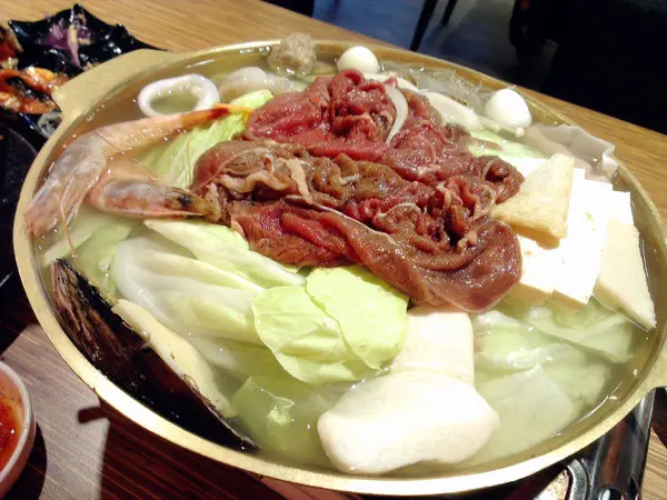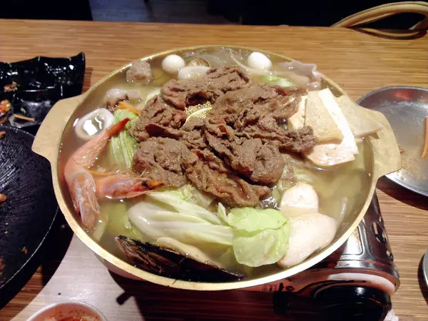 只要一講到韓式火鍋烤肉類的 就會馬上想到銅盤鍋拜韓劇盛行的福 台灣也越來越常見到這項餐點了湯類就像一般的火鍋清湯底放在一盤煮火鍋料內有 豆腐 鳥蛋 貢丸 花枝 冬粉 蝦子 杏包菇 及高麗菜