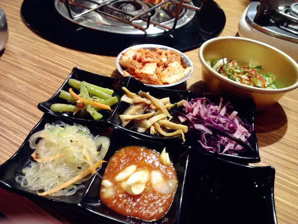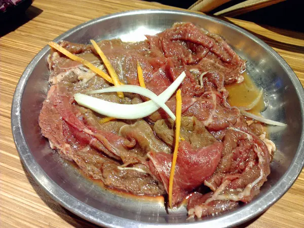 至燒烤肉付的有生菜 牛五花蔥絲 泡菜 沾醬還有付四樣小菜其中泡菜及生菜可以免費再續一次
