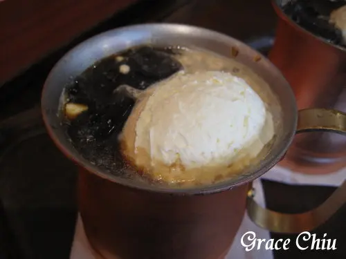 我們點了二杯大杯維也納咖啡,咖啡以銅質馬克杯呈裝,攪拌時感覺咖啡裡的冰塊還不少,光上層就看到五顆,喝到後來發現裡面至少加了十顆冰塊吧~