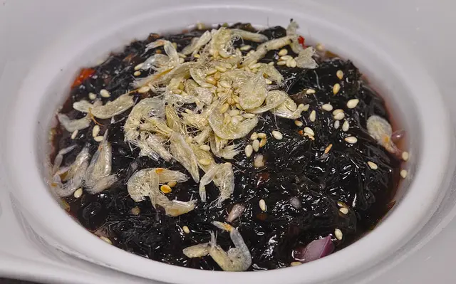 上層鋪滿了蝦皮, 底下則墊了紫洋蔥, 用醋佐味微酸, 有點類似沖繩水雲醋的口感