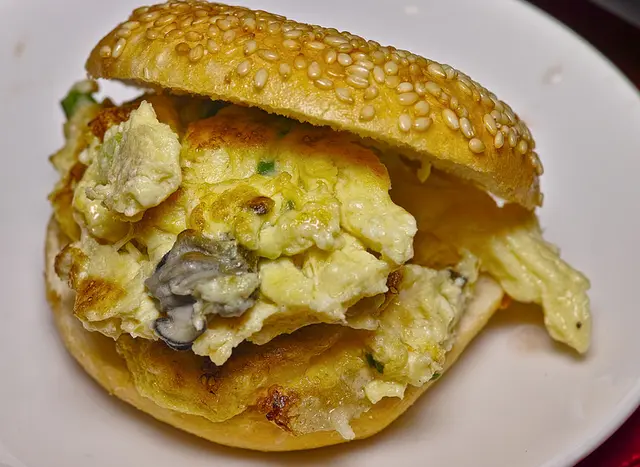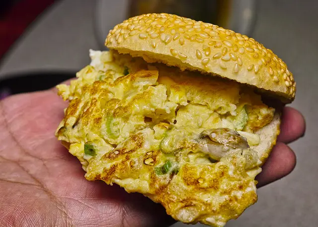 吃法也就很簡單, 必需要先克制住把蚵仔蛋直接吃掉的衝動, 餅本身已經像一些貝果一樣切開