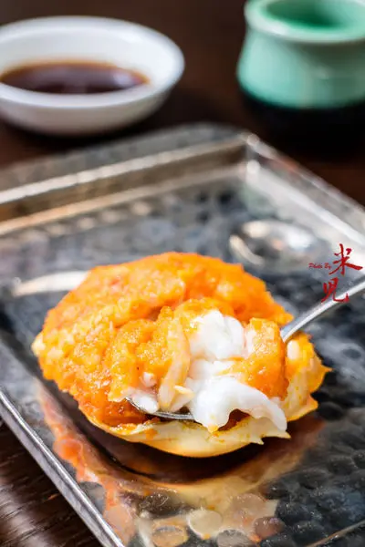 蟹黃焗蟹蓋是用賽螃蟹這道老菜的概念改良而成,鮮香嫩滑。在大閘蟹的季節會選用大閘蟹製作。