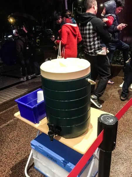 一蘭拉麵很貼心,怕客人在外面等太久會口渴,還準備了一大桶的水讓等待的人可以喝~