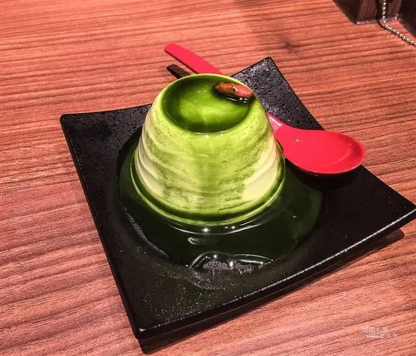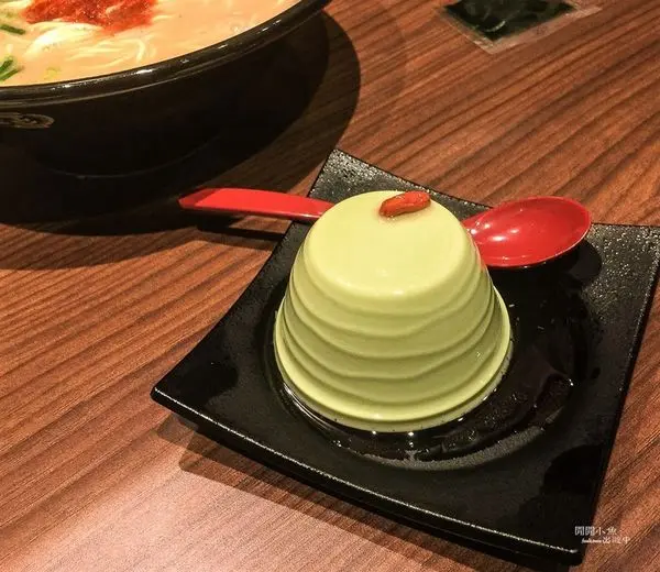 小小一個看起來像布丁的杏仁豆腐,原本看起來很普通。淋上濃濃的抹茶醬之後, 總算比較有抹茶杏仁豆腐的感覺了~
