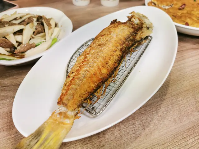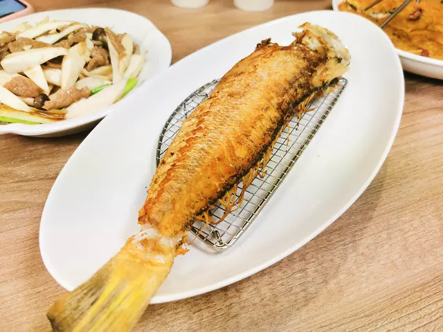 馬頭魚煎得超酥的,魚身下還放了一個鐵製的濾網,應該是用來架高魚身讓油滴落