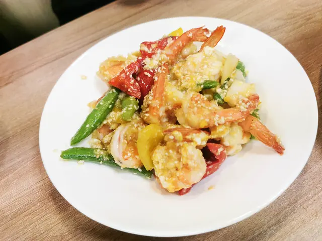 我想要吃到的金沙蝦是把鹹蛋黃用油炒成金黃細緻的泡末,均勻的裹再蝦肉上