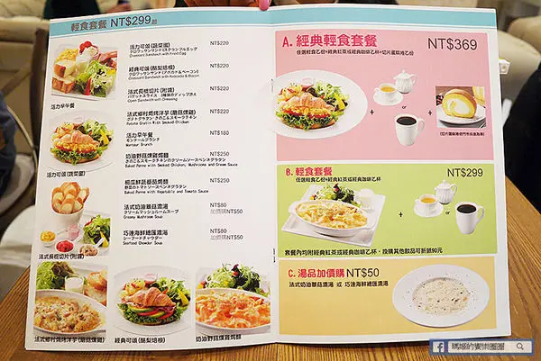 在下午茶除了有甜點可選擇外,也有輕食的套餐組合,有活力早午餐、可頌和局焗麵等選擇,可搭配飲料或甜點組合為套餐,價格較實惠