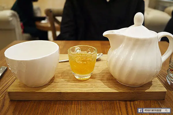 「蜜柚紅茶」150元,以白色瓷具,搭配一小杯蜜柚用木盤盛裝送了上來