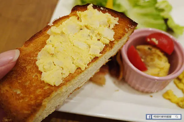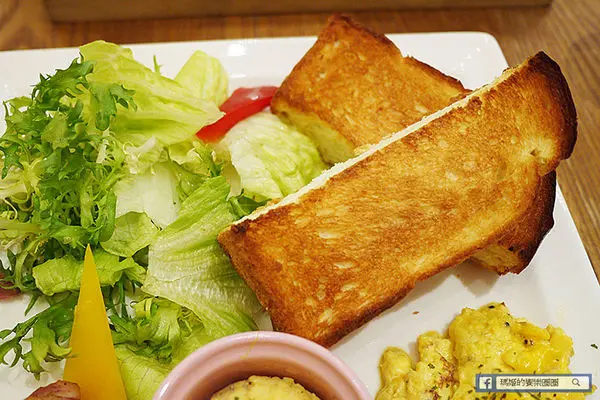 烤厚片吐司就超好吃的,外層烤得酥,內層十分鬆軟又有濃郁奶香味,熱度也夠,有拉回整體的分數XDDD。不過旁邊的生菜沙拉,原本應該會附一杯柚香沙拉醬,不過被遺忘了,後來才跟服務人員反應才送了上來,有了柚香沙拉醬多了香甜和滋潤感,不然我們第一口吃下沒有醬的生菜時,頓時有馬兒在吃草的感覺,雖然這樣可減少熱量的攝取啦,哇哈哈!