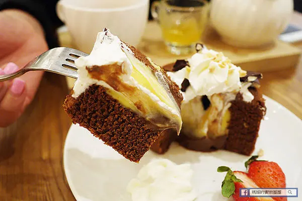 切開來裡面是香甜不膩的可可內饀,外層的則是酥皮做的塔皮,非常香酥可口,並非一般的派皮喲!整體口感真的好吃,且讓人回味,甜點真的大加分!