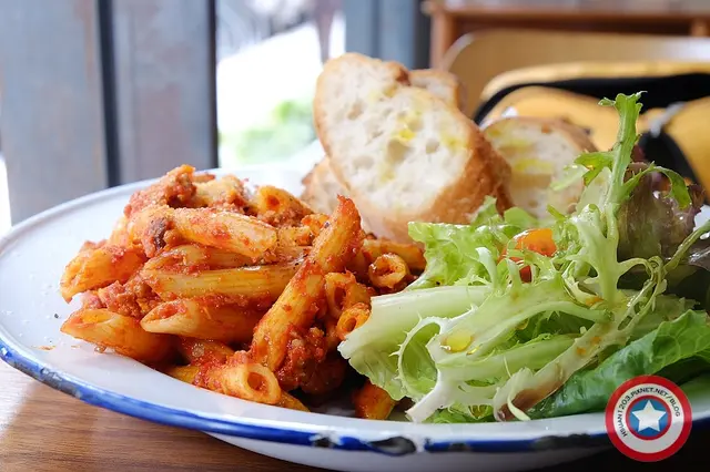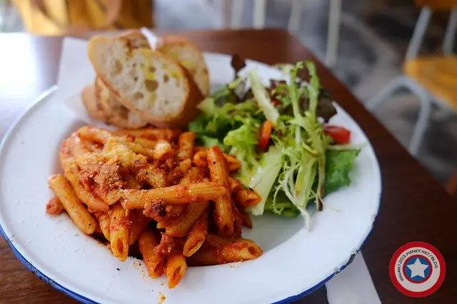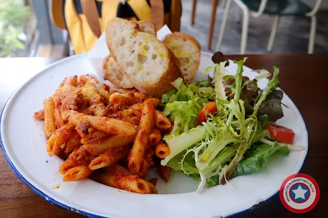 除了筆管麵外還附上油醋沙拉及法國麵包