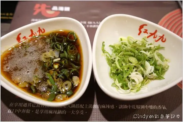 另外右邊的蒜苗加入一點辣湯 沾辣鍋的食物