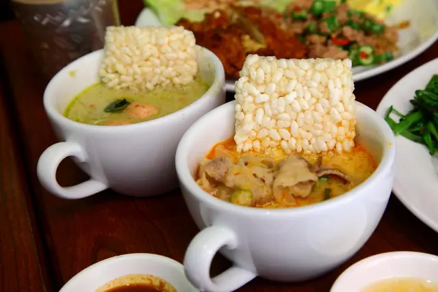 泰式咖哩也很道地好吃,咬咬比較喜歡綠咖哩,辣香十足還帶有濃郁的椰奶香,沾著鍋巴一起吃別有一番風味