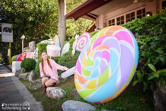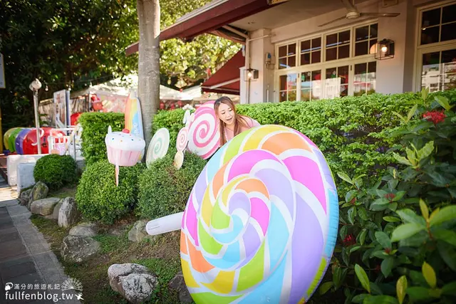 餐廳草坪上置滿了棒棒糖和大蛋糕