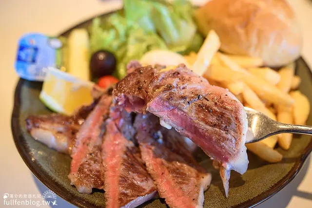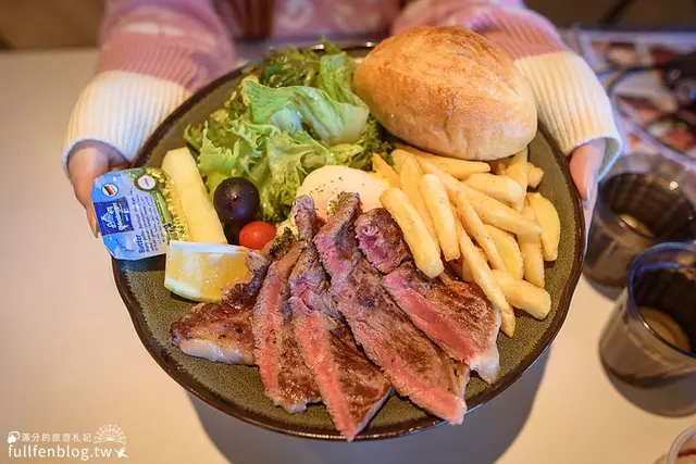 餐盤裡有生菜沙拉、主餐紐約客牛排