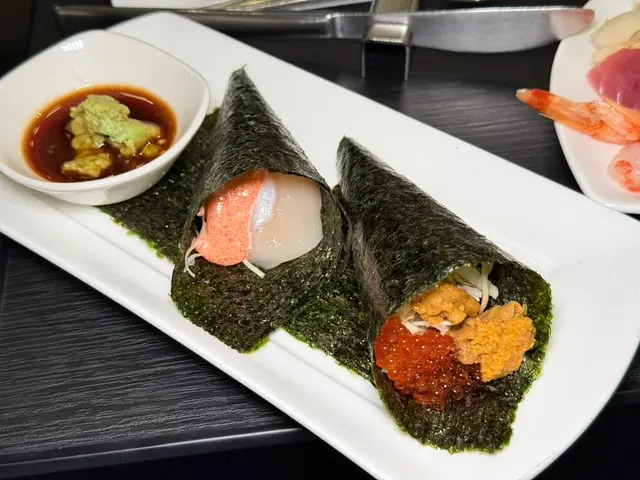 ▼海膽鮭魚卵手捲,