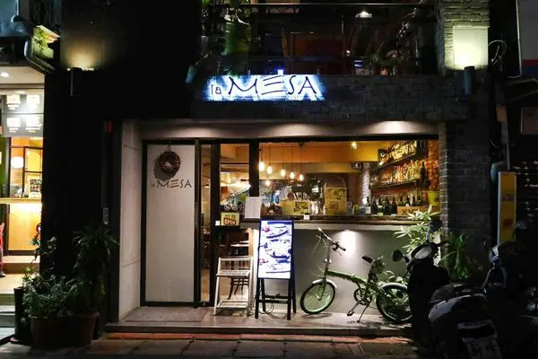 La MESA 位於國父紀念館1號出口附近,淡藍色燈光突顯招牌,透明窗口一排的酒瓶與昏黃的燈光照映著,