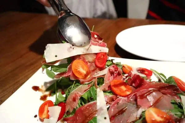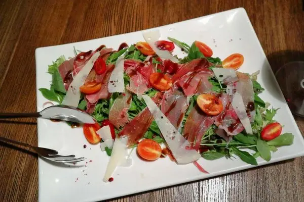 芝麻葉與火焰生菜特殊的香氣伴隨著微微苦味,搭配西班牙火腿、小蕃茄及帕馬森起司片和著巴薩米可酒醋,