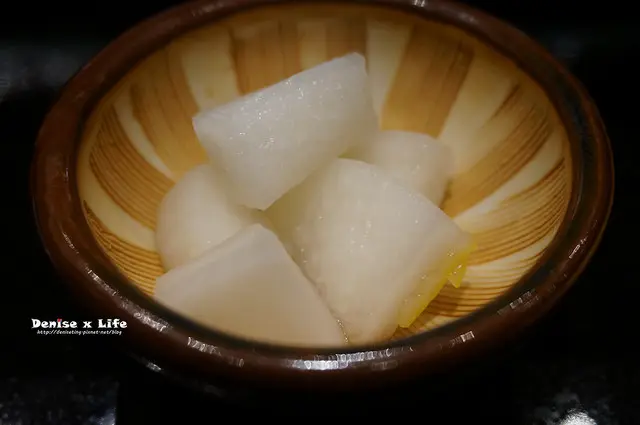 今天提供的柚子蘿蔔為師傅自製。青脆蘿蔔搭上柚子酸甜口味,淡淡的卻十分回味