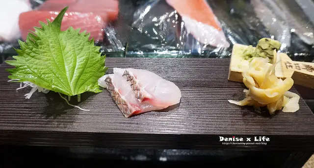 在料理長建議下,一片搭配紫蘇葉另一片試試原味來吃。比起上款生魚片,青圭的魚皮Q彈肉軟嫩
