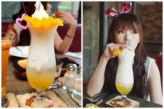 女孩最愛款!下層是檸檬蘇打水,頂端放了一顆冰淇淋跟奶油,再妝點幾瓣水蜜桃切片!