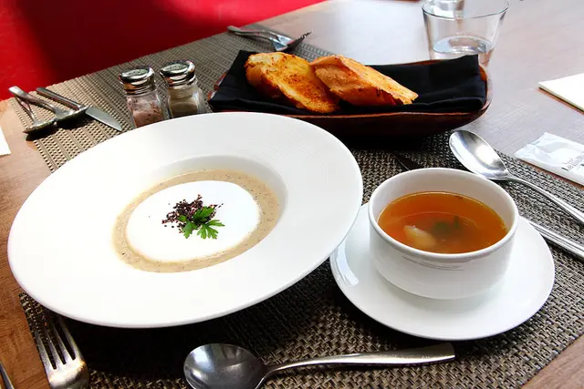 套餐附的湯(徳式牛肉清湯&牛菌菇泡沫蘑菇濃湯)與法式手工麵包