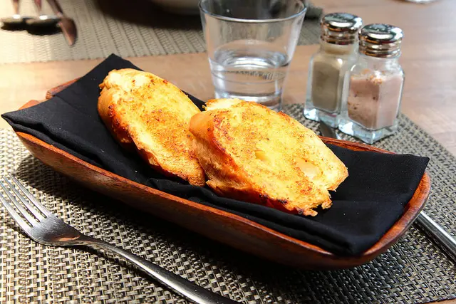 法式手工麵包上頭抹上香蒜醬一起烘烤,帶著濃郁的蒜香,麵包體外酥內軟相當好吃