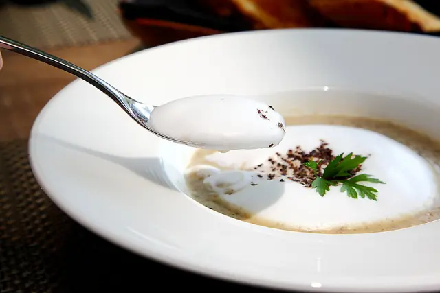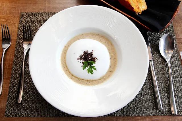 運用分子料理的做法,以多種菌菇及洋蔥慢火熬煮,入口濃稠細膩,香氣四溢