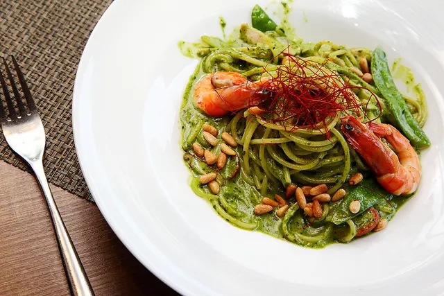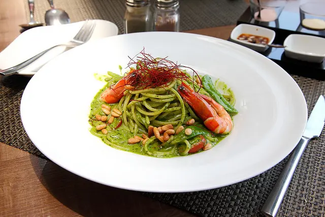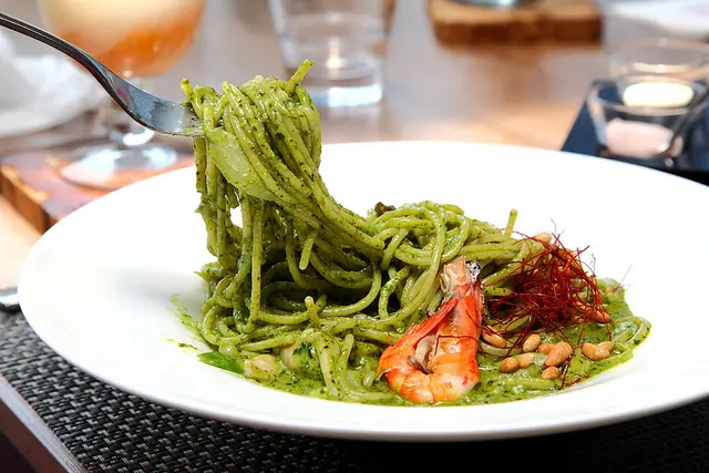光是從亮麗的綠色色澤,撲鼻的羅勒鮮香,再撒上大量的松子,可以想見這松子青醬雞柳肉義大利麵不簡單