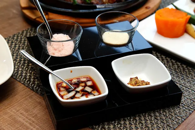 牛排會附上四種包括玫瑰鹽、柚子鹽、洋蔥醬油及芥末籽醬
