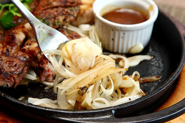 牛排下面的洋蔥也不要放過,經過鐵板跟肋眼油脂的煎炙,香甜軟嫩又帶著濃郁肉香