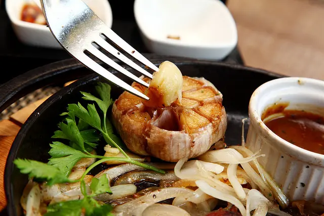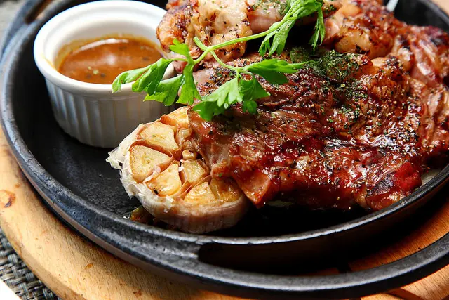牛排下還蓋著一顆烤蒜,肉汁也滲入其中,經過烘烤的蒜瓣不斷飄著淡淡蒜香