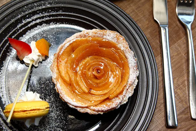 酸甜帶有肉桂香蘋果片經過熬煮有著Q脆的口感,跟塔皮很搭,造型也很有美感,像一朵綻開花朵似的