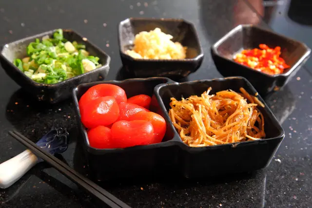 兩款醃漬小菜、蔥花、蒜、辣椒,這都可以無限續加的